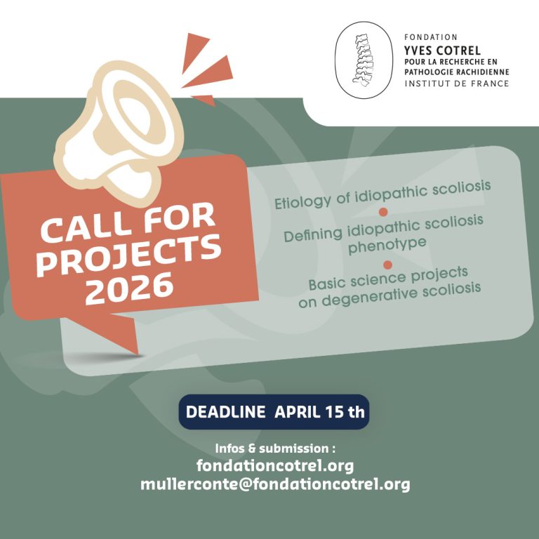 Since 2000, the Fondation Yves Cotrel has funded 89 research projects worldwide. Although carried out in different disciplines, they all have the same aim: to identify the causes and understand the mechanisms of evolution of idiopathic scoliosis.